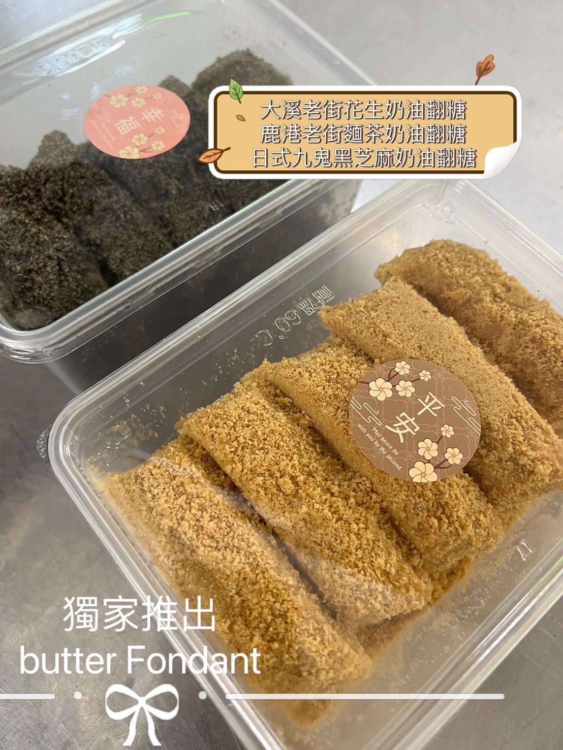 獨家配方,年節新推出奶油翻糖裹入你喜歡的元素,常溫品嚐會像大溪老街賣的麥芽花生糖一樣軟綿帶點Q,冷藏吃會像牛軋糖或像貢糖有嚼勁!