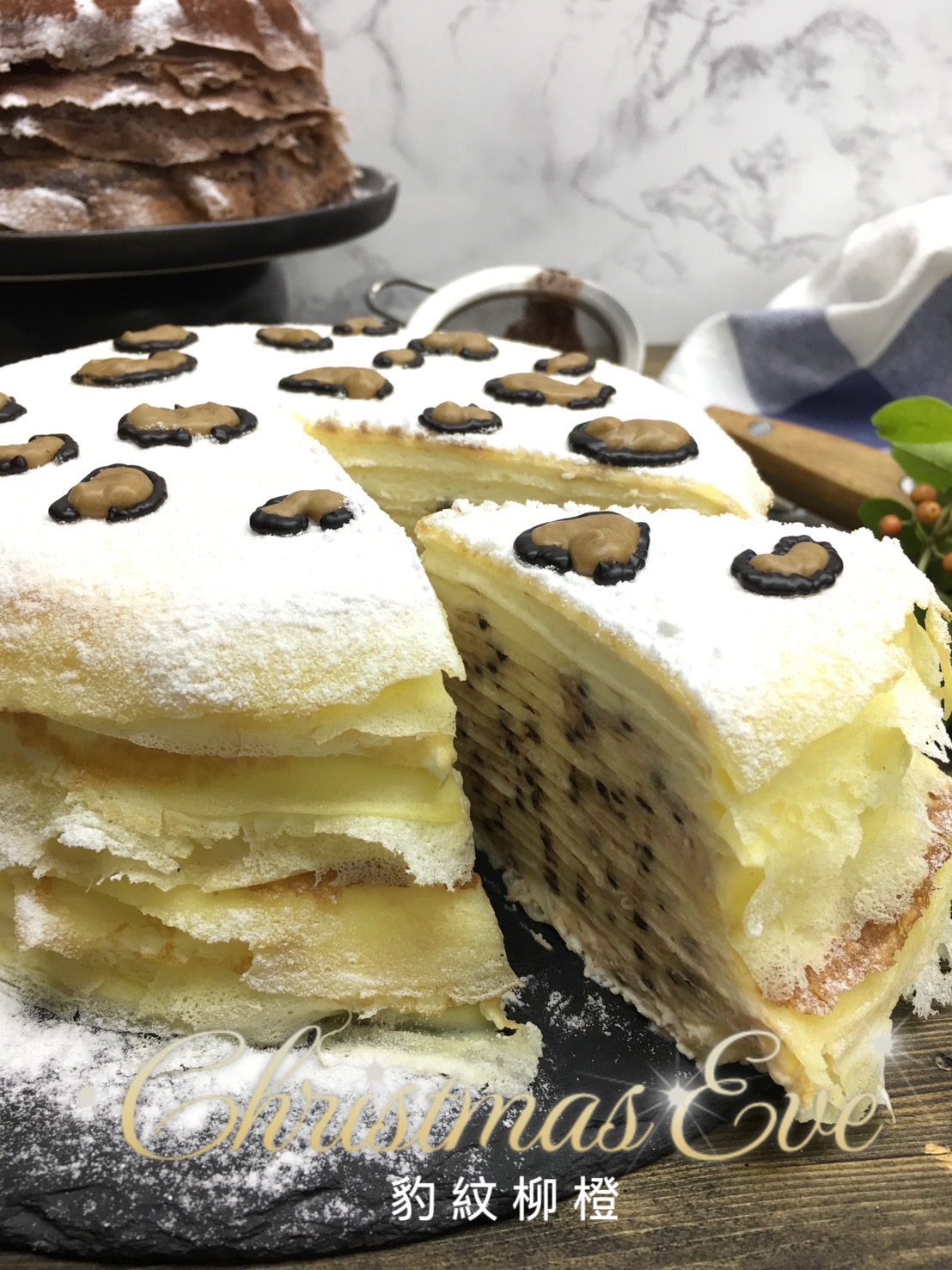 以超過二十層的手工法式薄餅製作而成,細緻綿密的新鮮奶油中散發淡淡的太妃糖香氣,頂層用焦糖微烤至金黃色(或巧克力粉裝飾),層層薄餅間搭配清新爽口的鮮奶油,讓每口蛋糕甜而不膩帶來令人驚豔的口感。